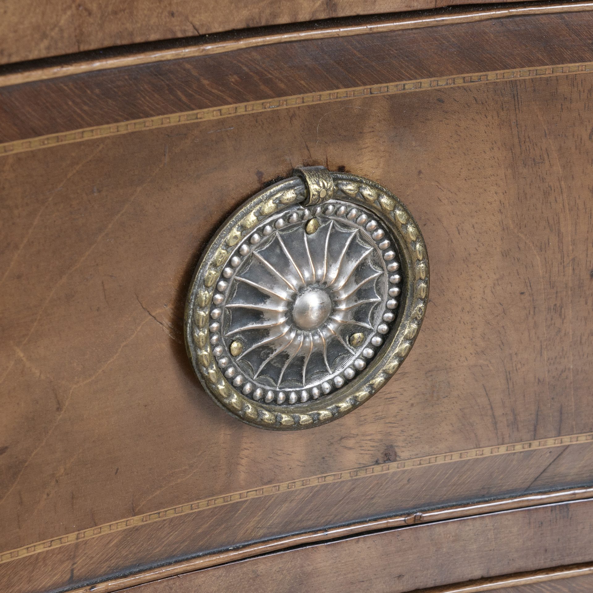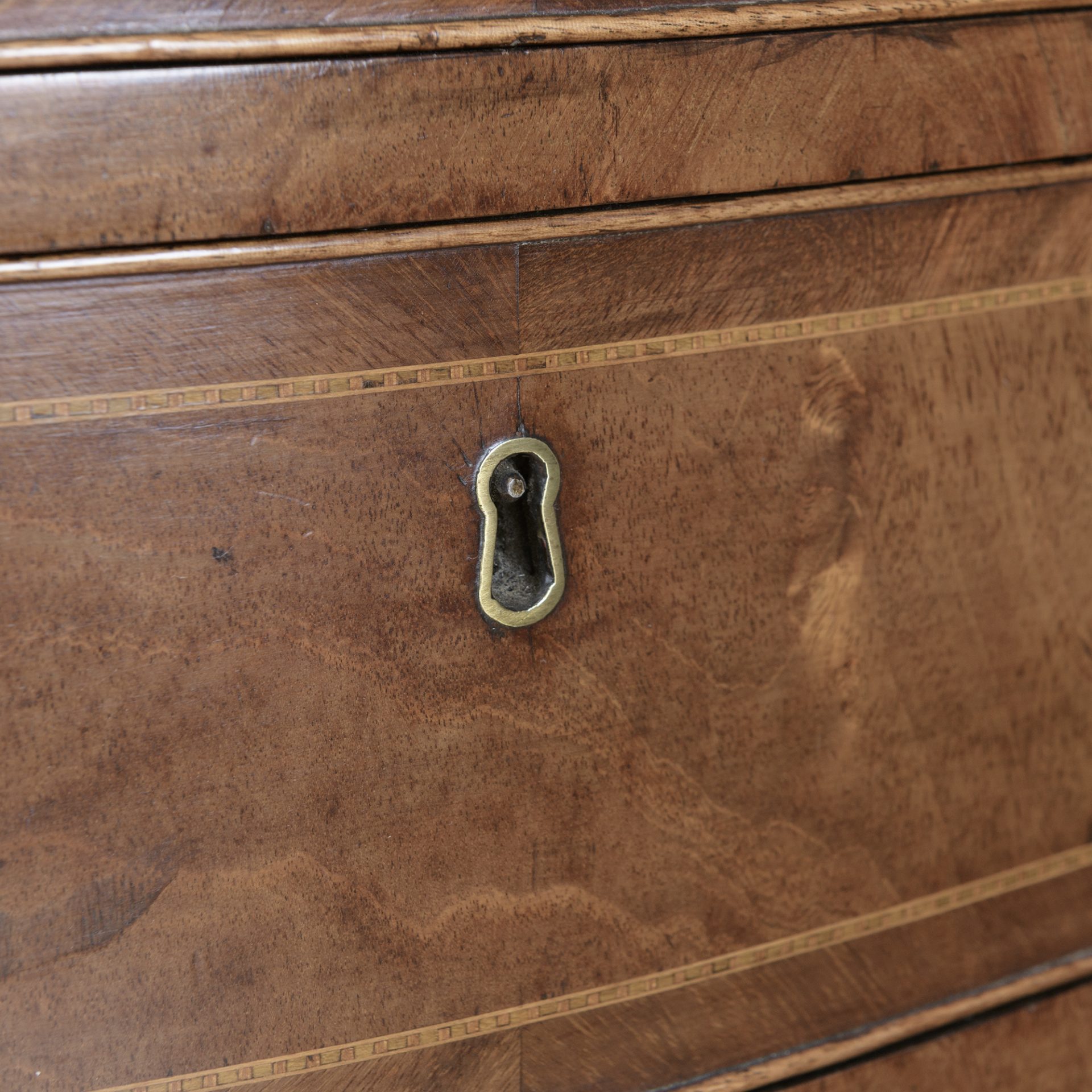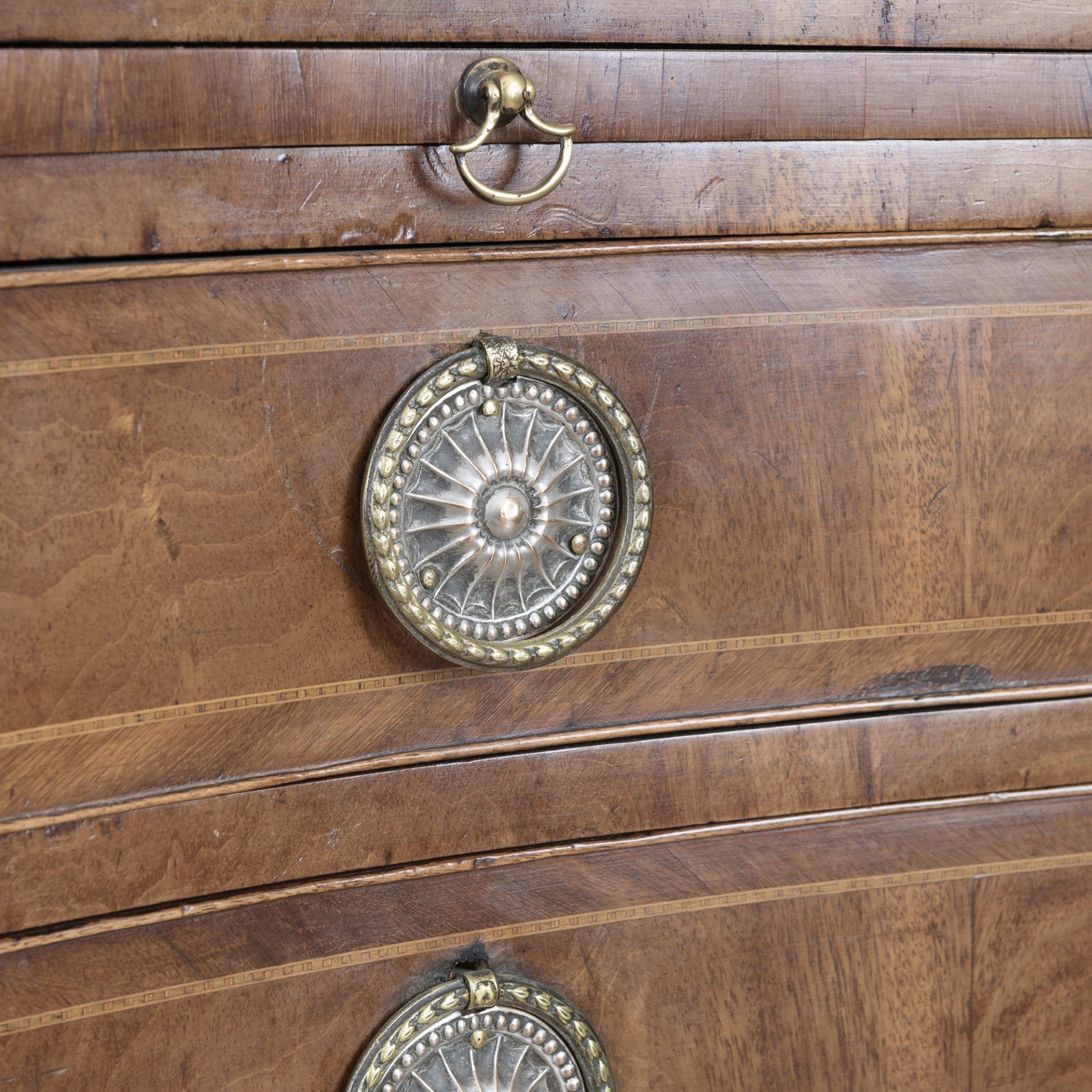 The drawer fronts retain the original silvered ring turned back plates and ring pulled handles although they have faded over the last two hundred handles. The oak lined drawers have gilt brass locks and oak bases with vertical mahogany cut veneers padouk cross banding and barber stringing to the drawer fronts.