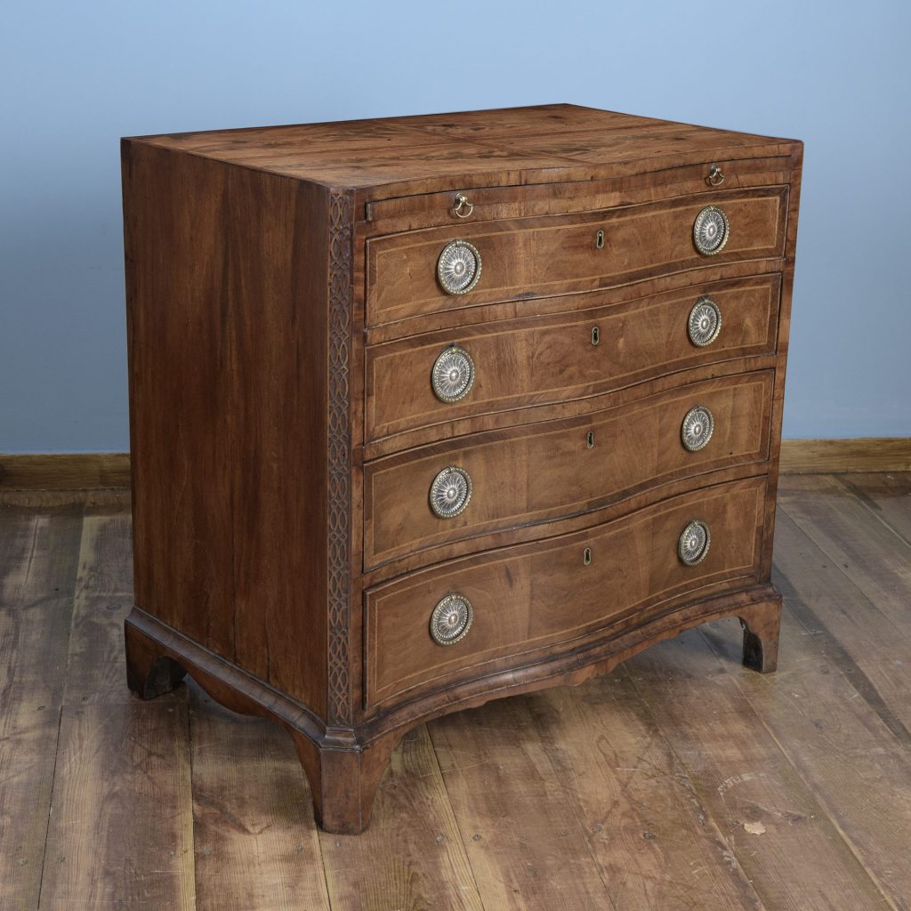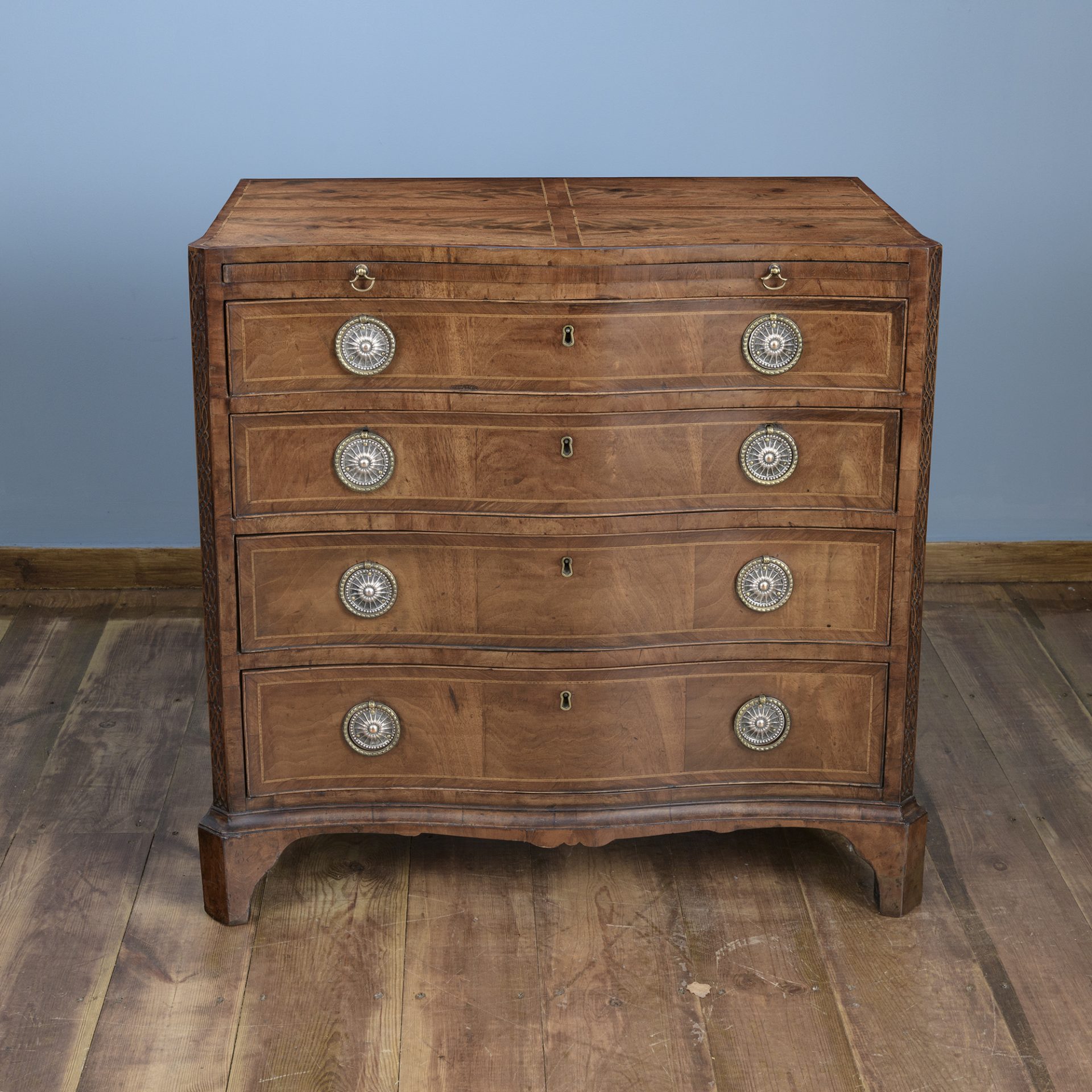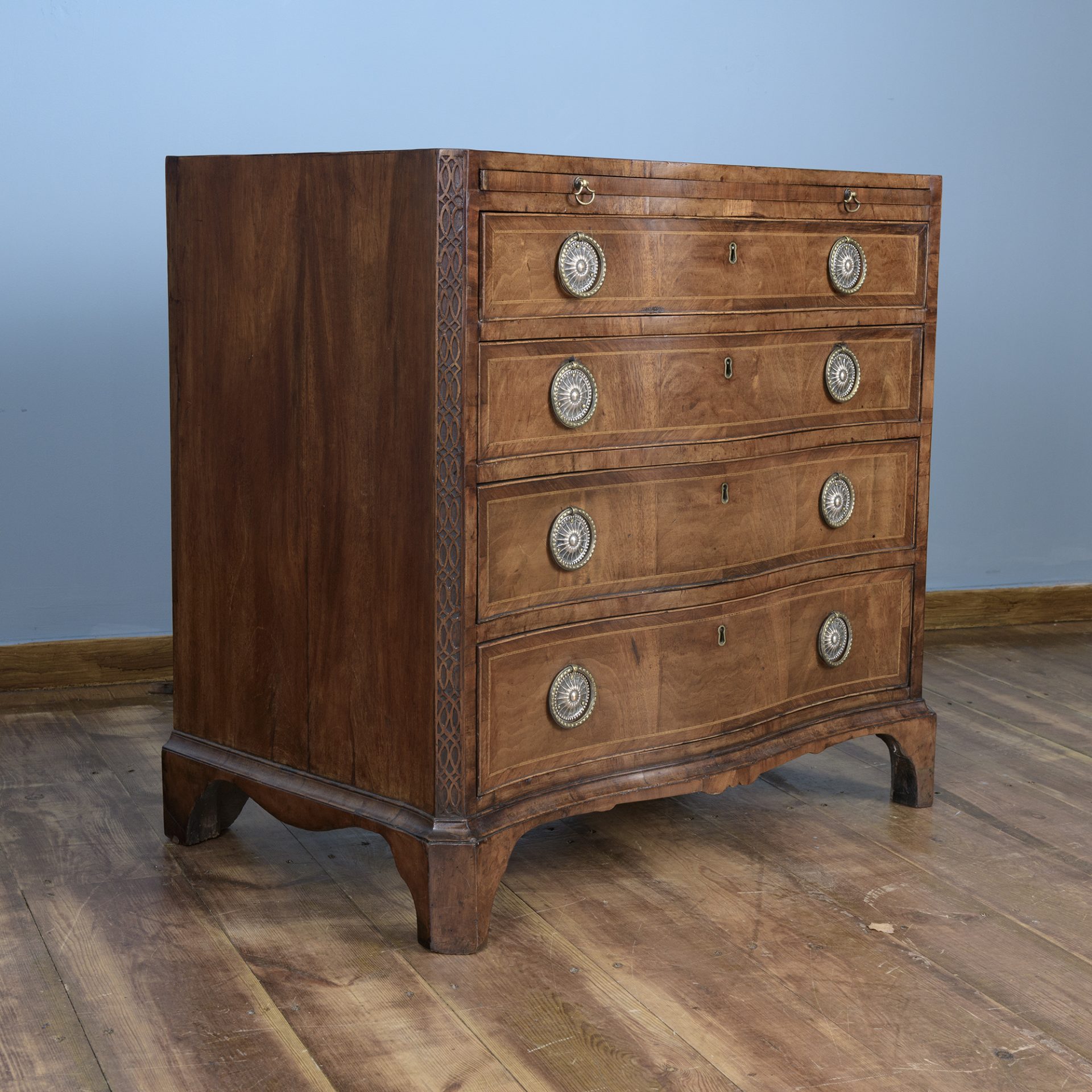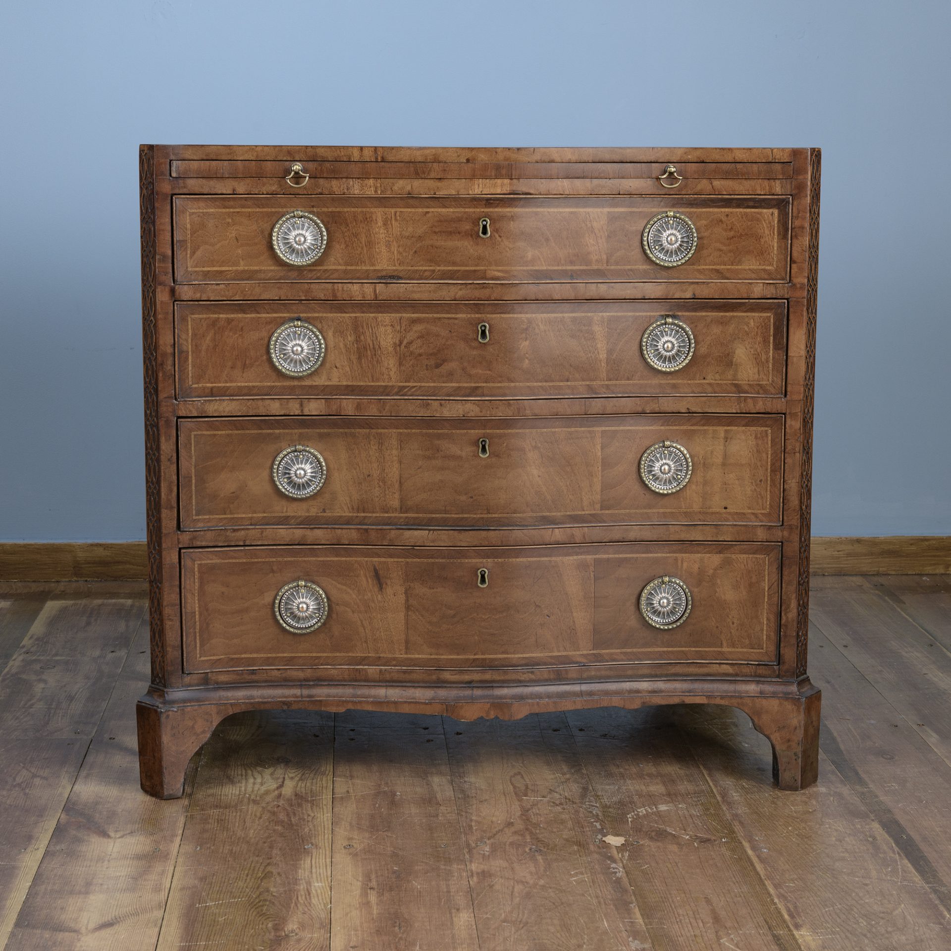 The drawer fronts retain the original silvered ring turned back plates and ring pulled handles although they have faded over the last two hundred handles. The oak lined drawers have gilt brass locks and oak bases with vertical mahogany cut veneers padouk cross banding and barber stringing to the drawer fronts.
