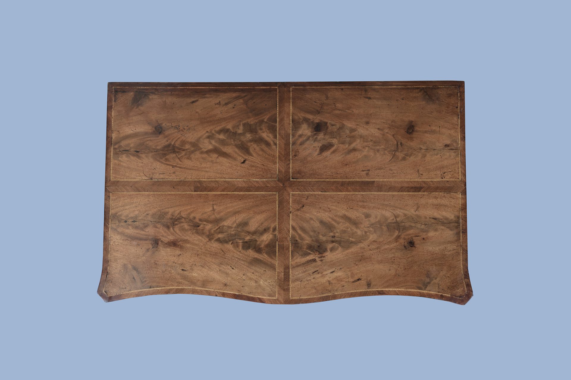 The blind fret carving to the canted corners and book-matched straight grain mahogany veneers to sides sit above a thumb nail moulding.