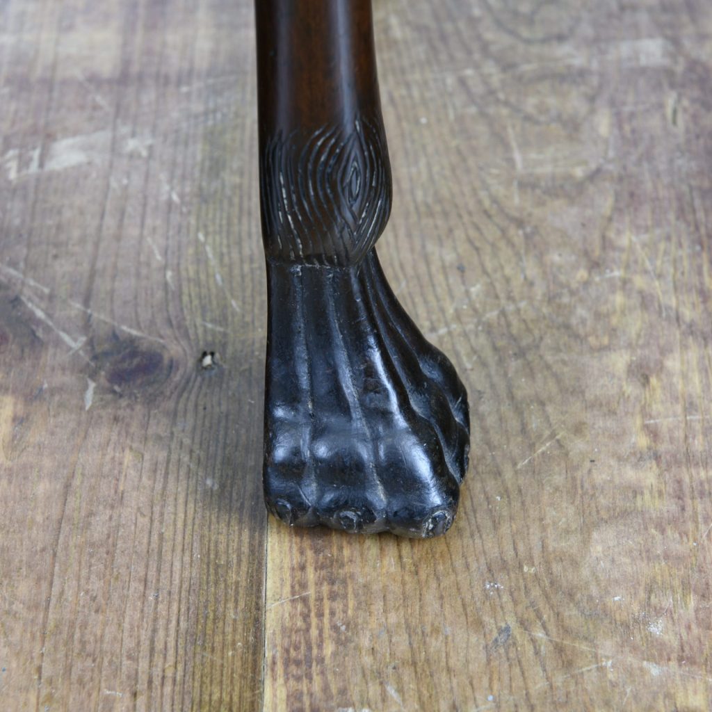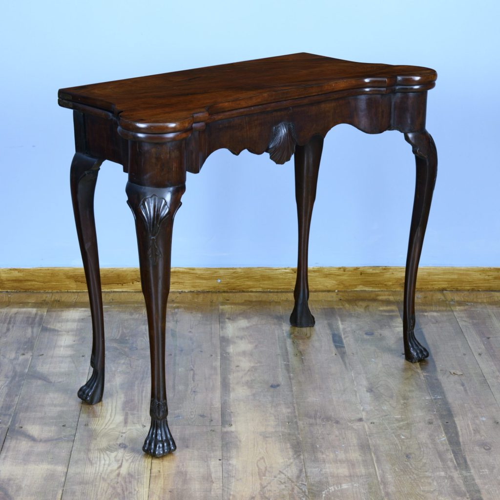 The Irish card table is raised on cabriole style legs with shell and trailing bell decoration to the knees. The tapering legs terminate on hairy paw feet. The table is compact, chic and elegant, it retains a good colour and is early 18th century antique piece of furniture.