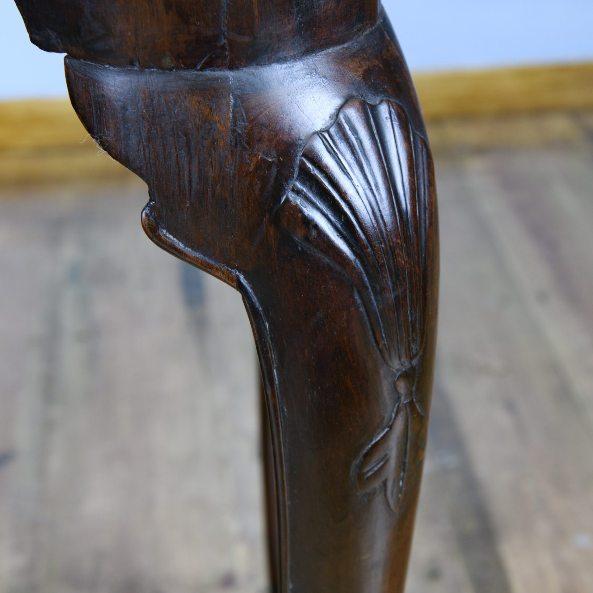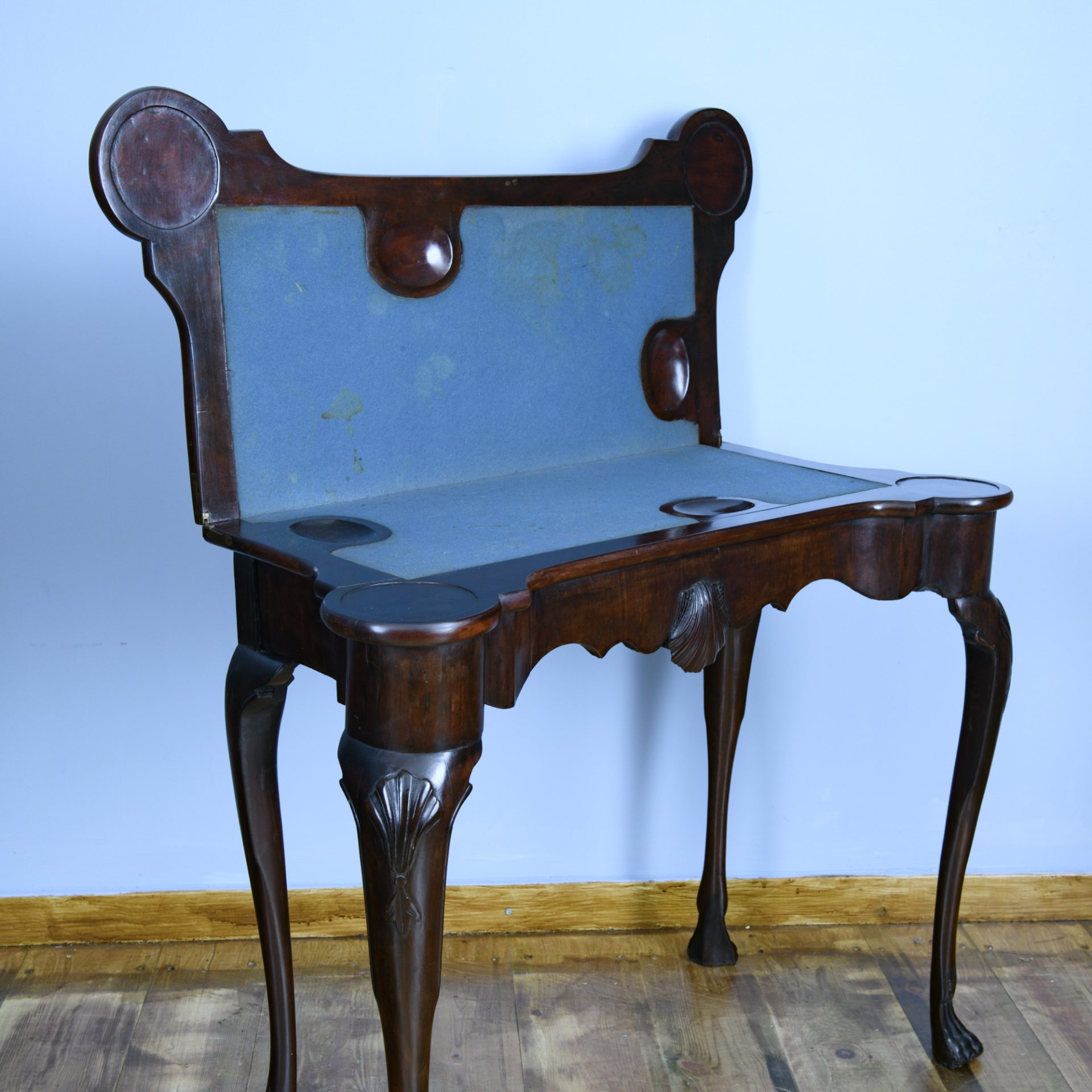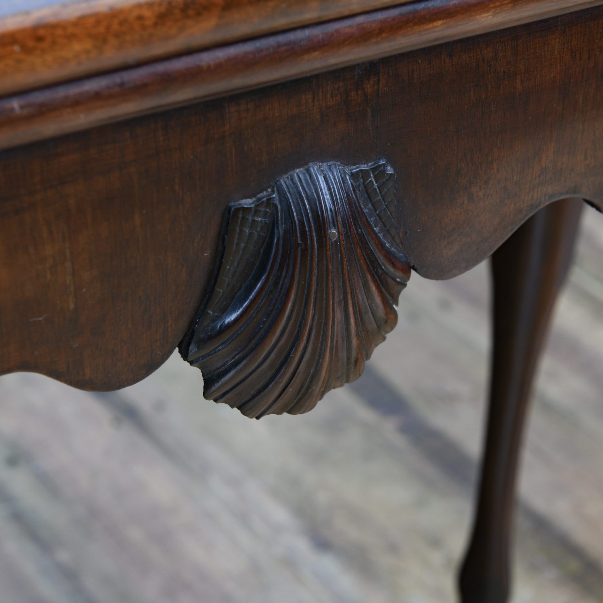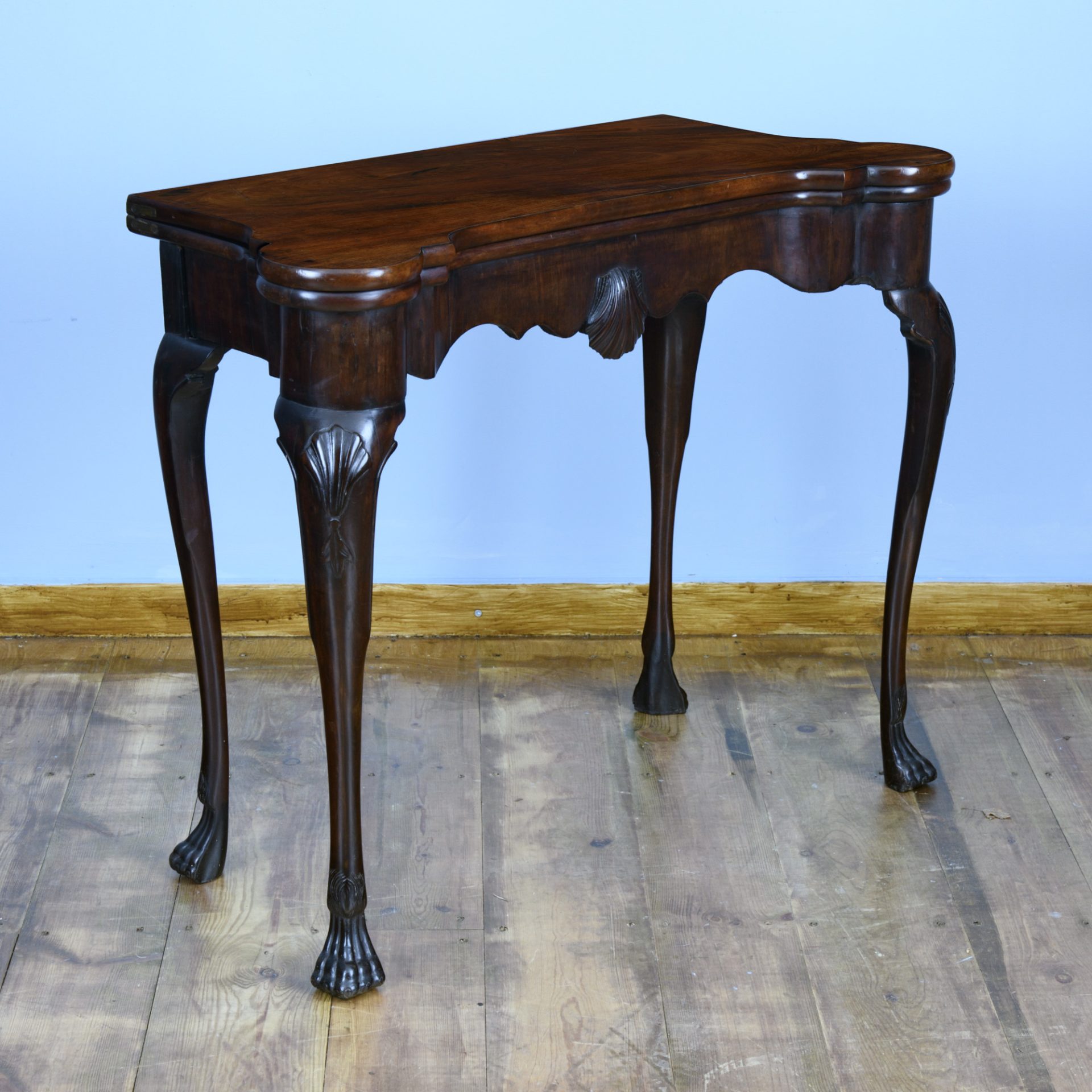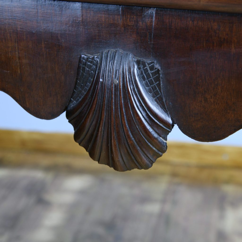 The folding concave top with a break front edge and rounded corners is exceedingly pleasant. The gate leg action to the rear bak leg allows the playing surface to be revealed. The mahogany frieze is shaped in reverse to the folding tops outline with a crisply carved inverted shell to the centre.