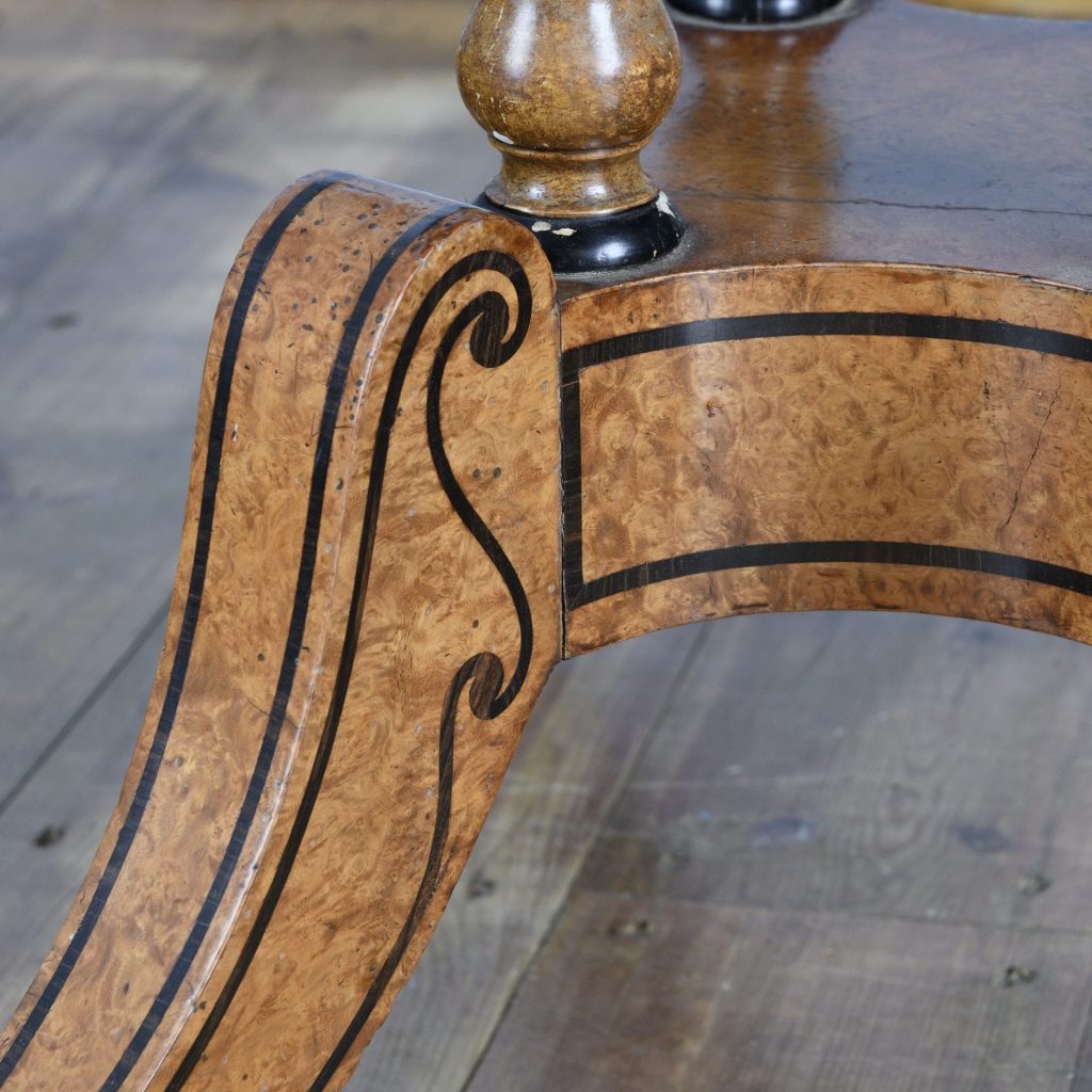 The table top is raised on four solid turned faux amboyna supports with ebonised ring turnings that sit on a concave plinth base. The plinth base is inlaid with macassar ebony and amboyna veneers and is supported by four elegant out-stretched tapered legs with matching inlays that terminate on the original gilt brass capped castors.