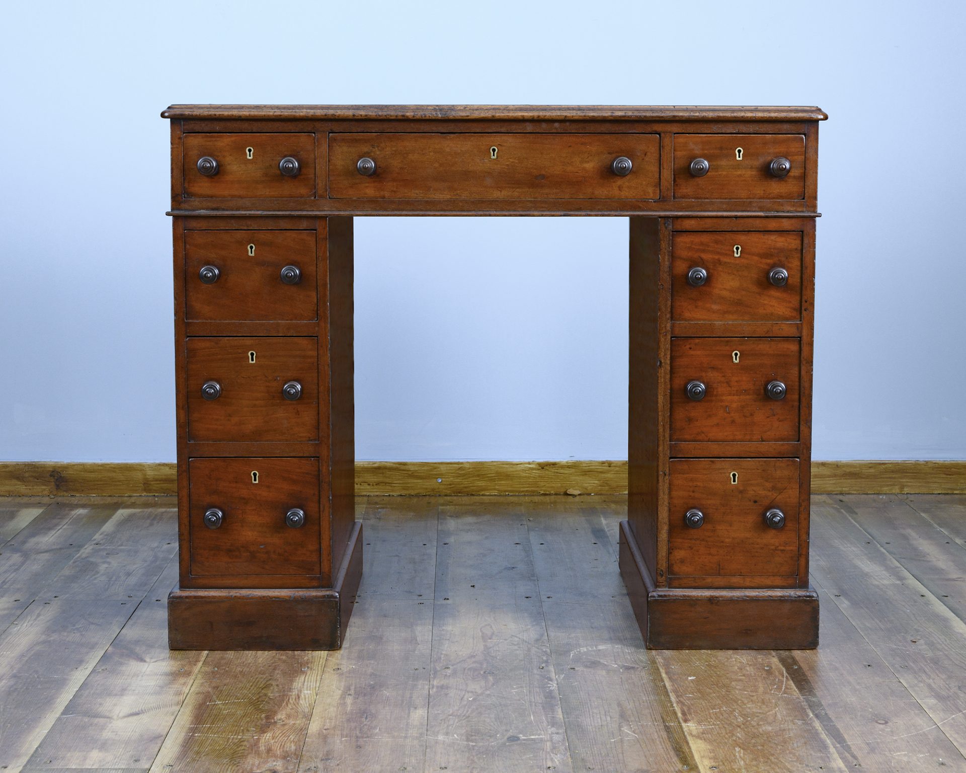The freize is fitted with two short and one long drawer above a fitted moulding, the mahogany lined drawers are full length with crisp dovetails retaining the original gilt brass 'Patent' locks. The mahogany turned knobs that adorn the desk are also original and compliment the brass escutcheons.