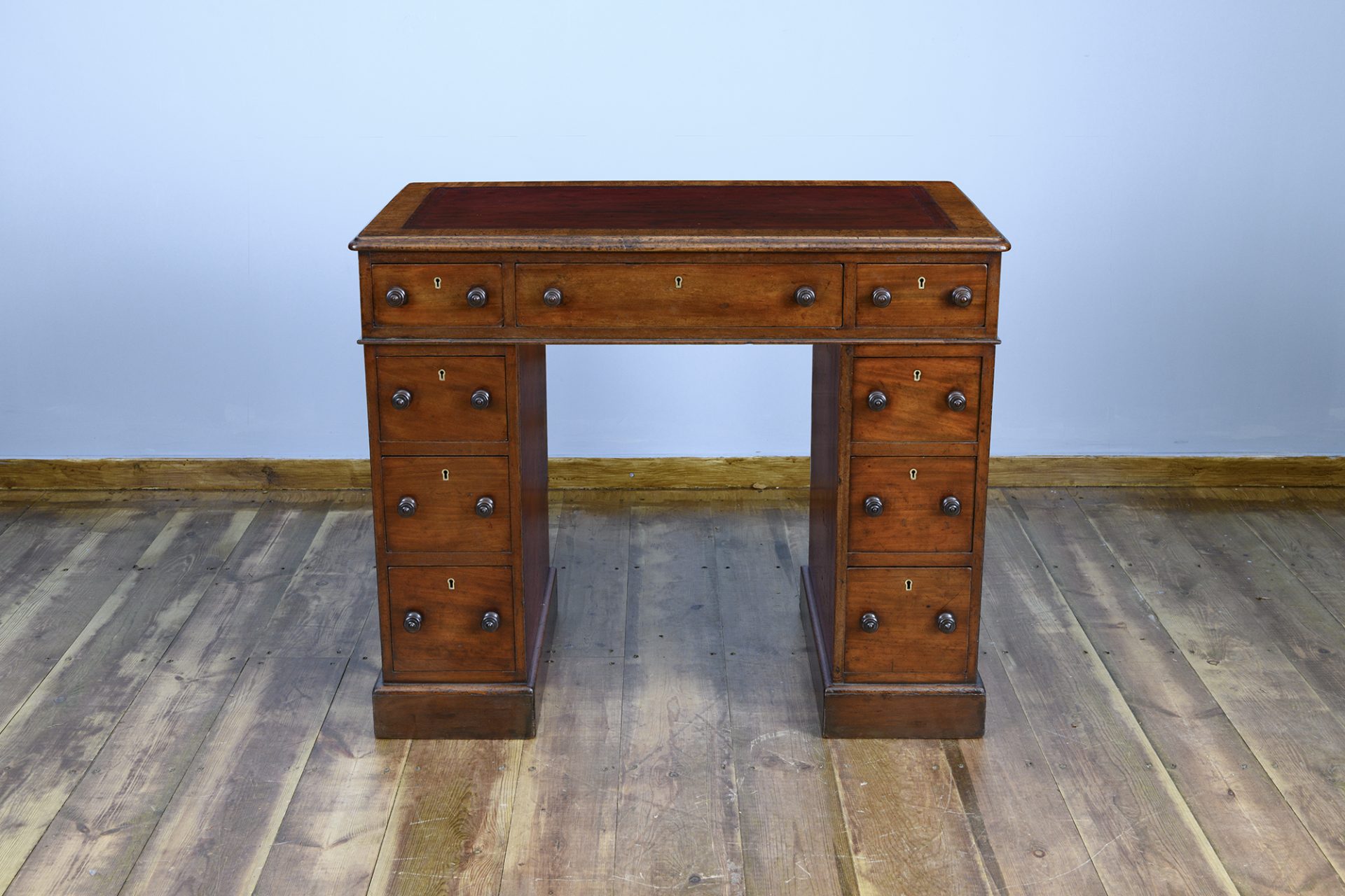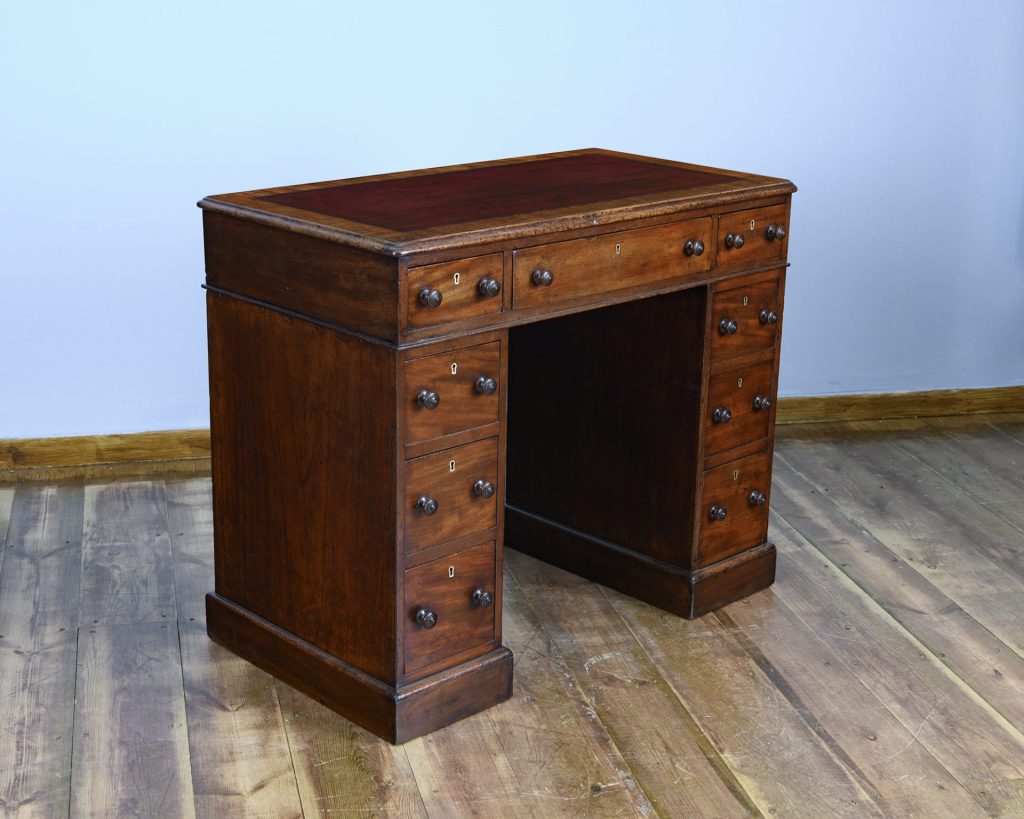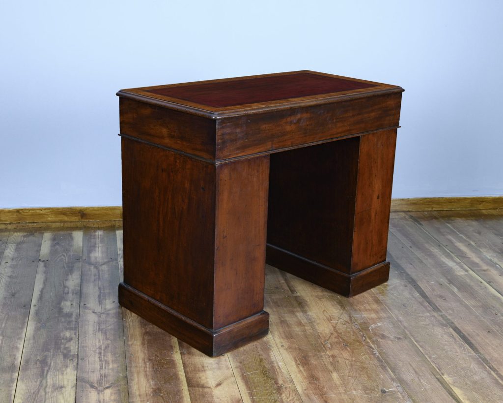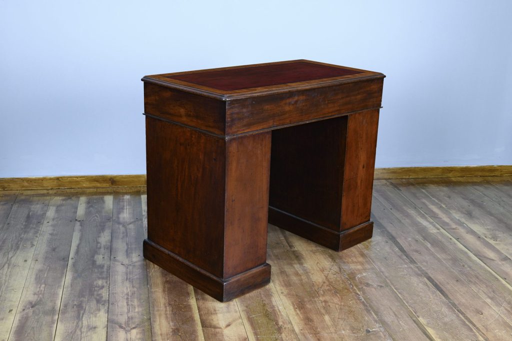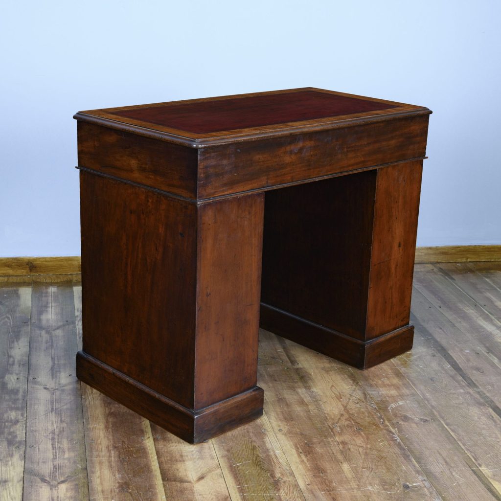 The rectangular tooled leather lined top is finished in the original red and cross banded in mahogany. The desk is free standing with a generous kneehole width.