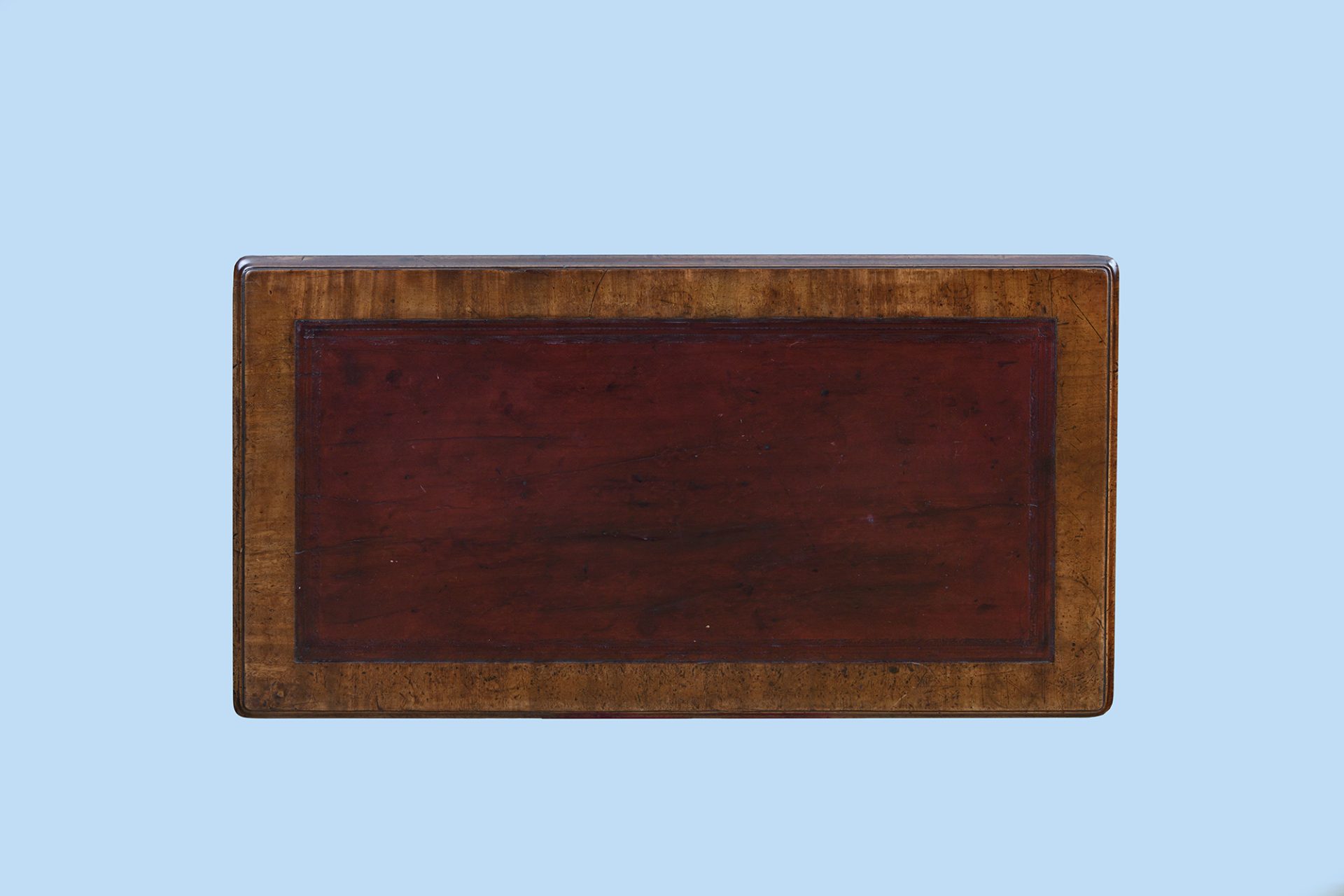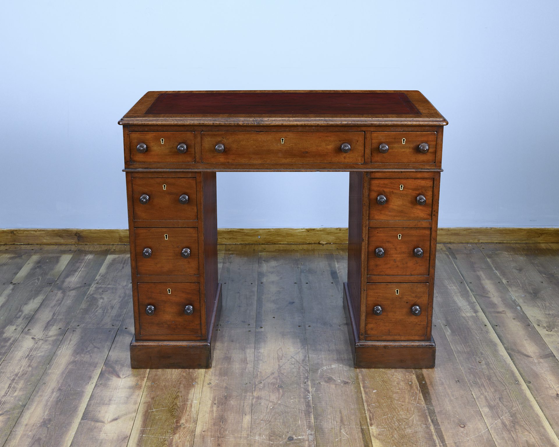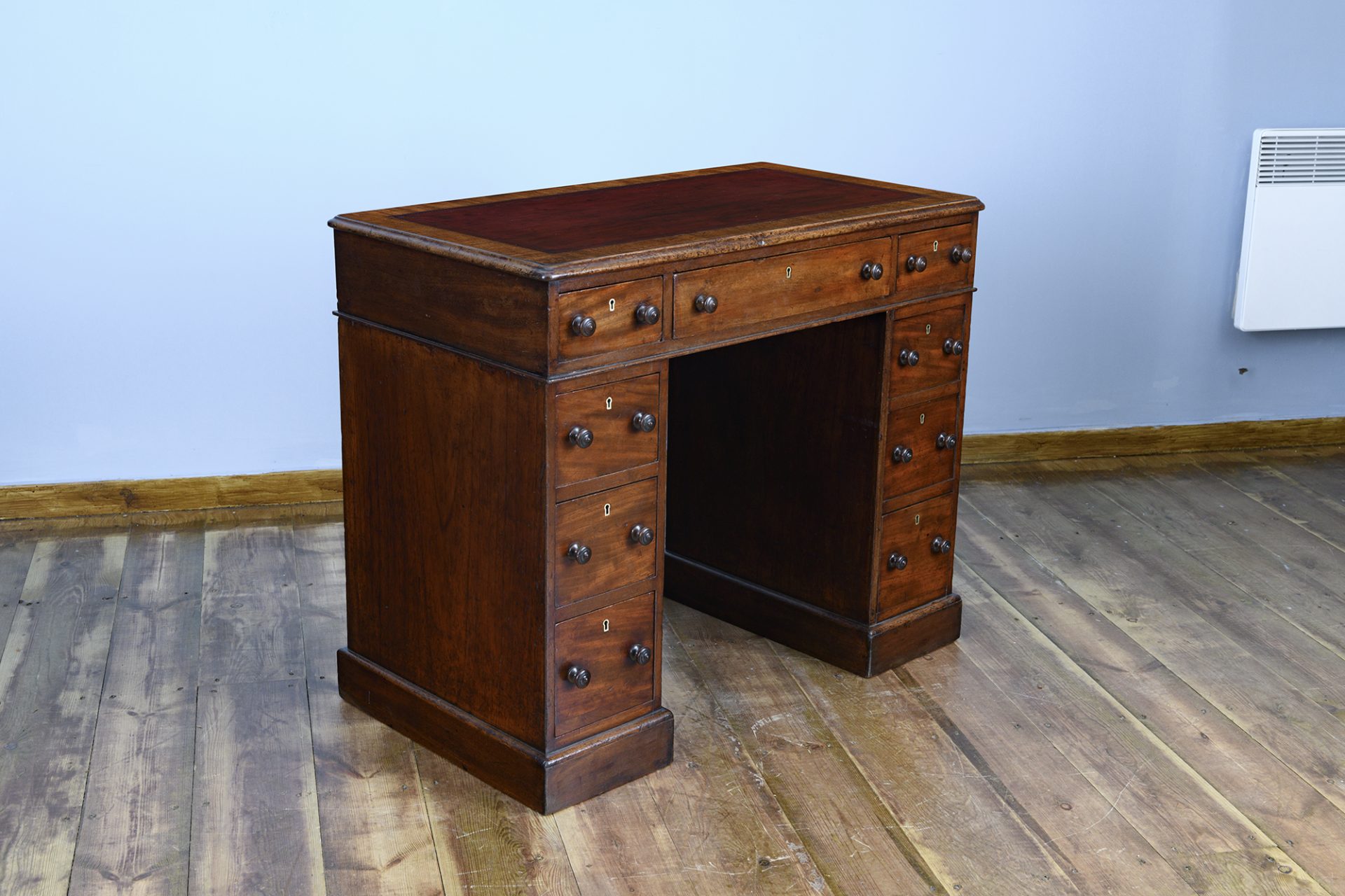 The rectangular tooled leather lined top is finished in the original red and cross banded in mahogany. The desk is free standing with a generous kneehole width.