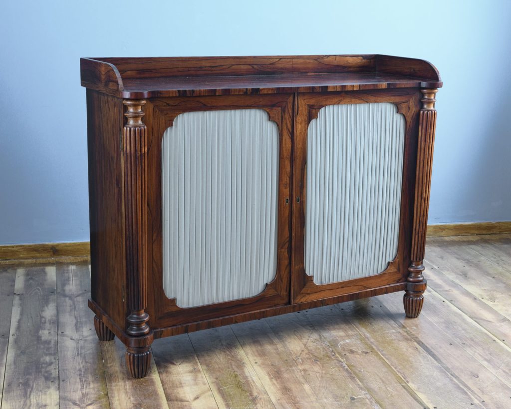 The blue silk pleated cupboard doors are framed with inverted corners and mitred to maximise the vivacious grain and open to reveal a two rosewood fronted shelves with the doors resting above a figured plinth edge.