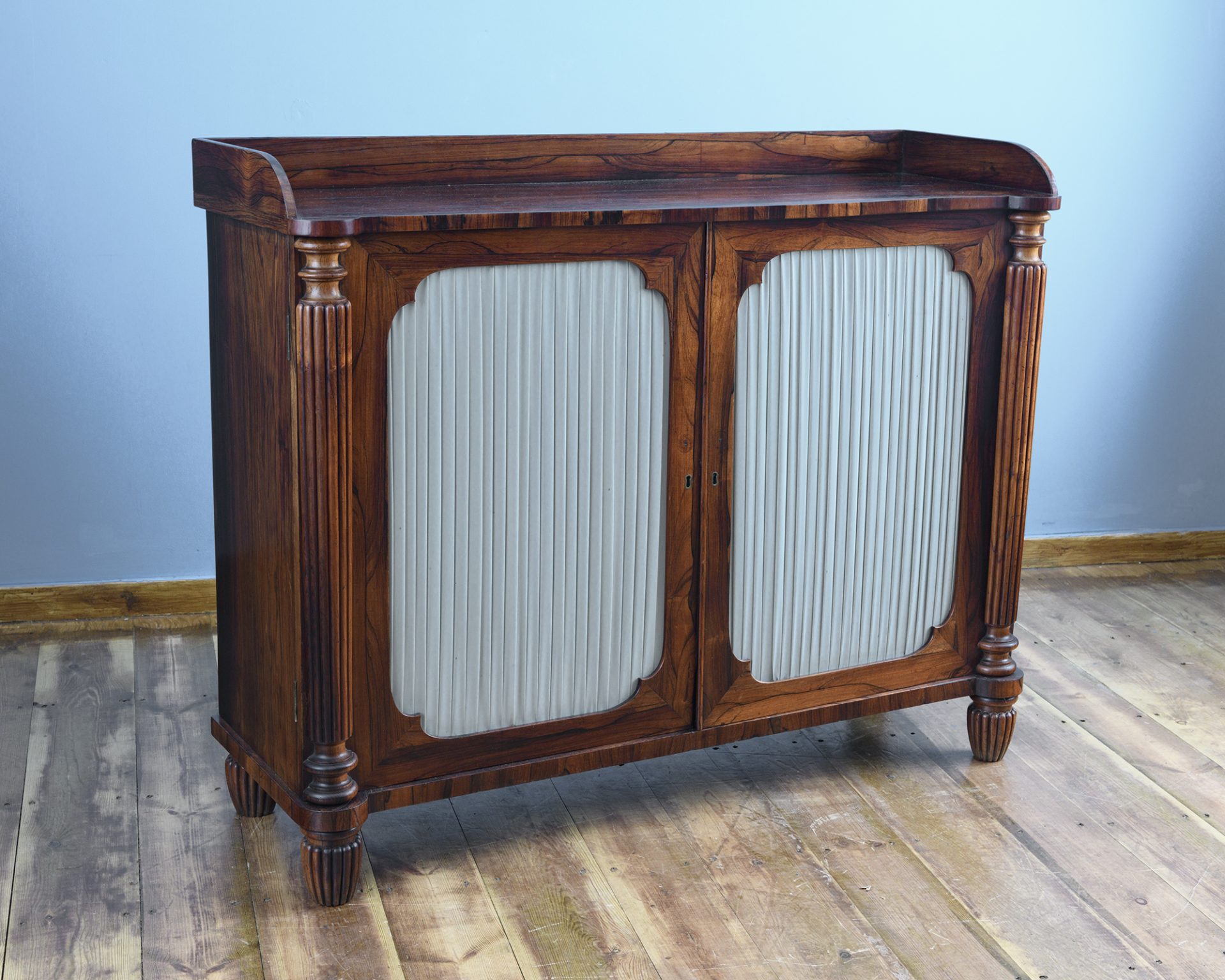 The Regency cabinet is raised on four 'Gillow Style' gadrooned bun feet to the front and the reverse below a rounded corner moulding.