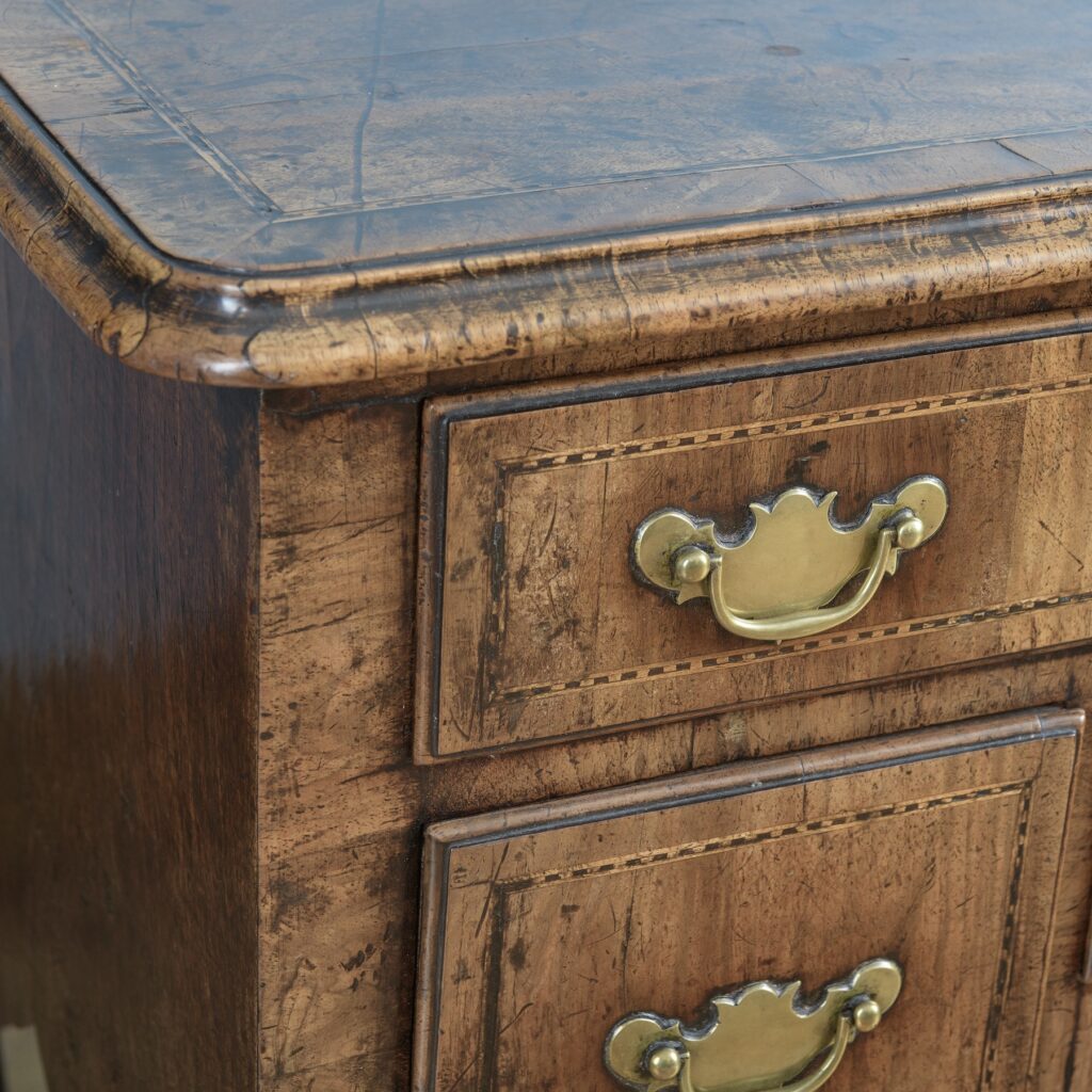 The top of rectangular form, with rounded front corners, quarter veneered, cross banded, with a thumb nail moulded edge. The front with a top long, oak lined, barber strung inlaid drawer fitted the original brass plate handles.