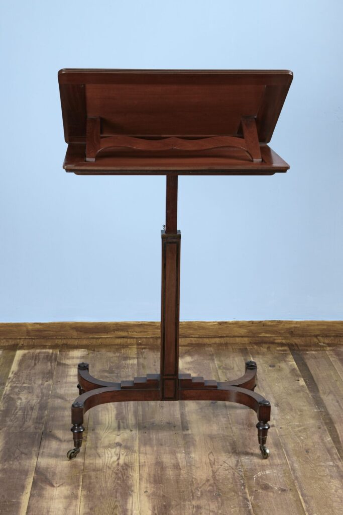 The metamorphic top with fine reeded edges sits above the original gilt brass collar moulding and a gilt brass pin. The mahogany support is pierced with several holes to allow various heights reaching a maximum height of 102.00 cm. The mahogany and ebony inlaid pedestal is finished to all four sides and conceals the metamorphic column when the music stand is at its lowest point of 75.00 cm.
