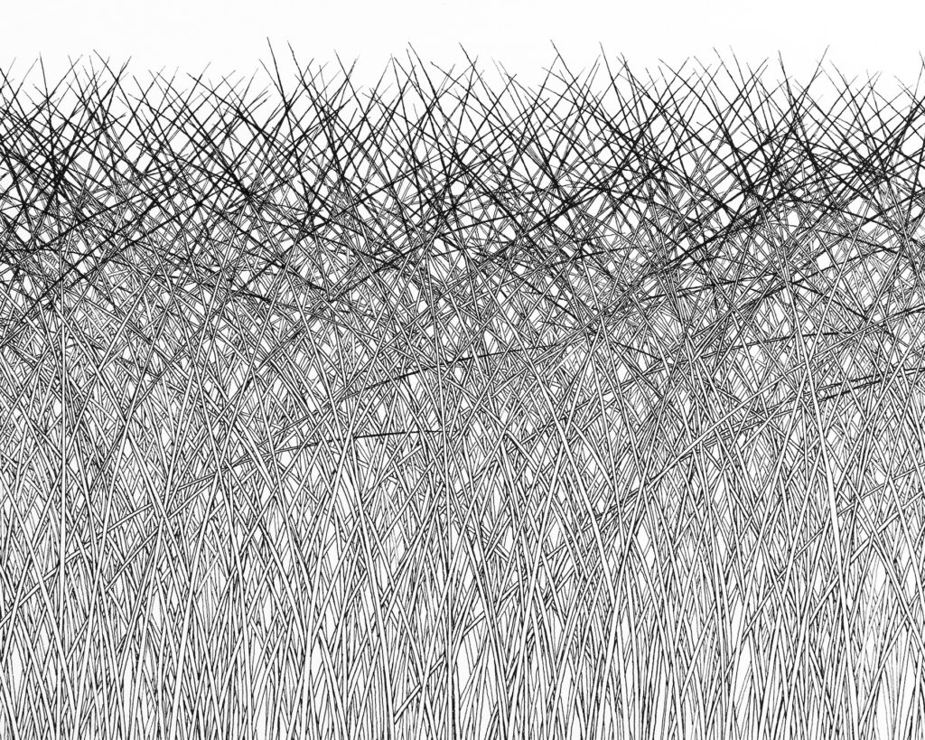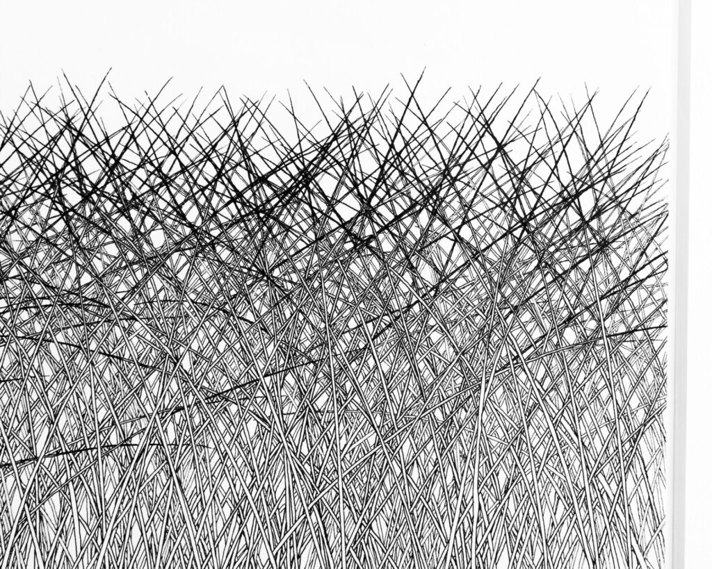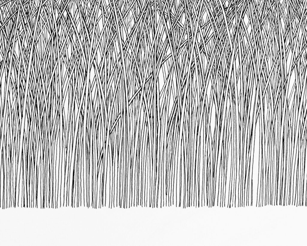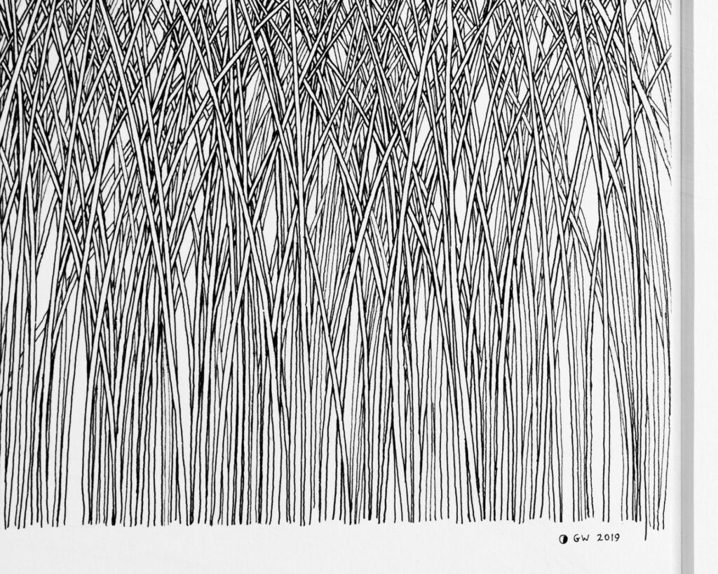 No noise, no wind, no air pollution. Stillness and perfect harmony, pure, unspoilt, permanent. So, are these blades of grass a few inches tall or monstrous 400 feet plants? The delicacy of the tops of these grasses, tipping over from the effects of gravity was an important part of controlling the line of the pen, one slip would ruin the harmony. Other subtleties include some blades tucked in behind some and in front of others. The ones most bent over never make it to the highest point and give depth to the top half of the picture.