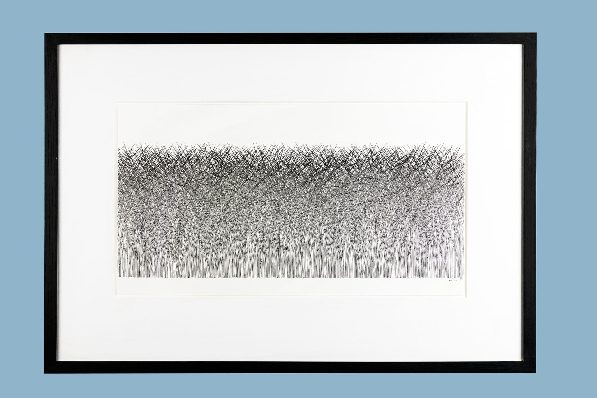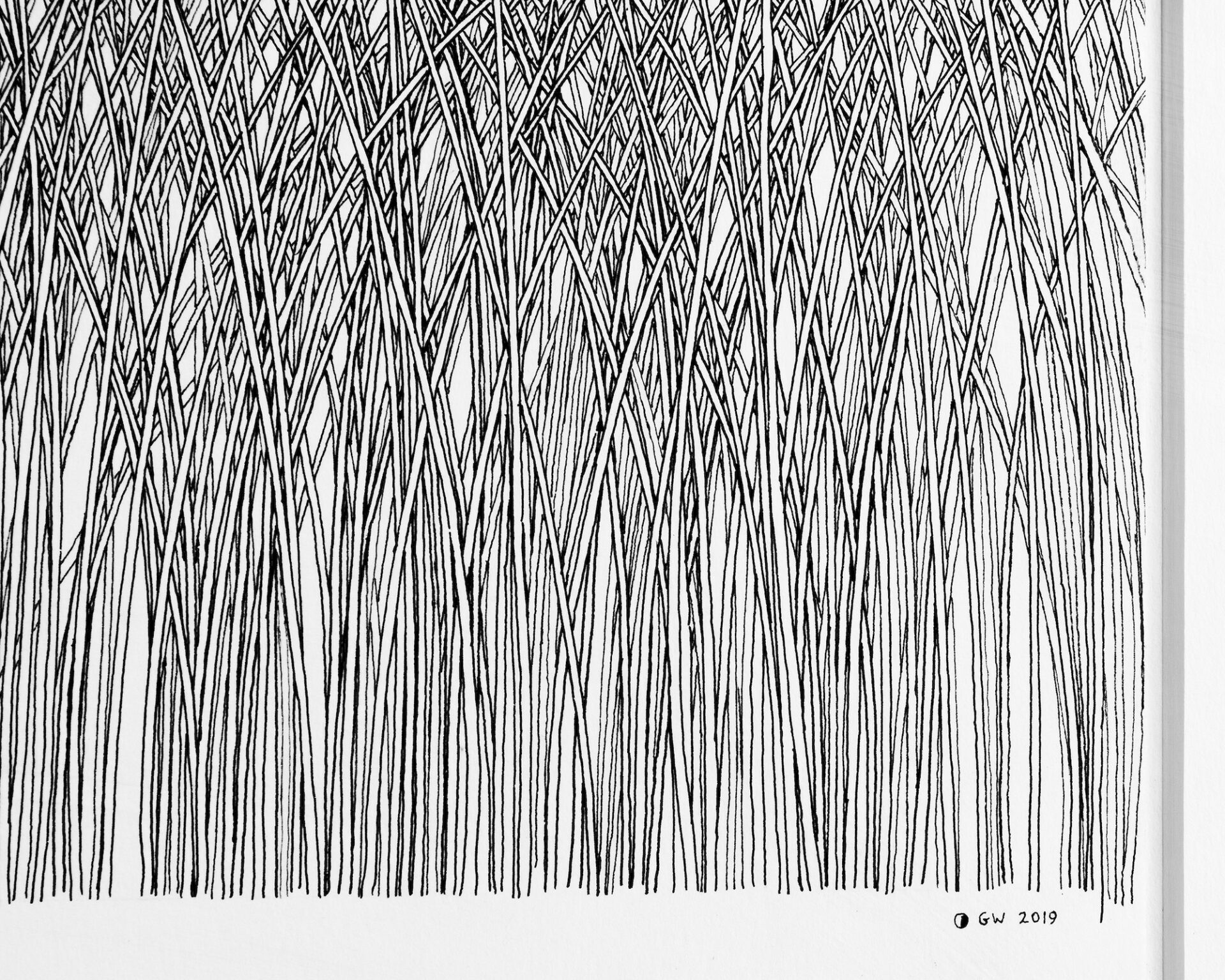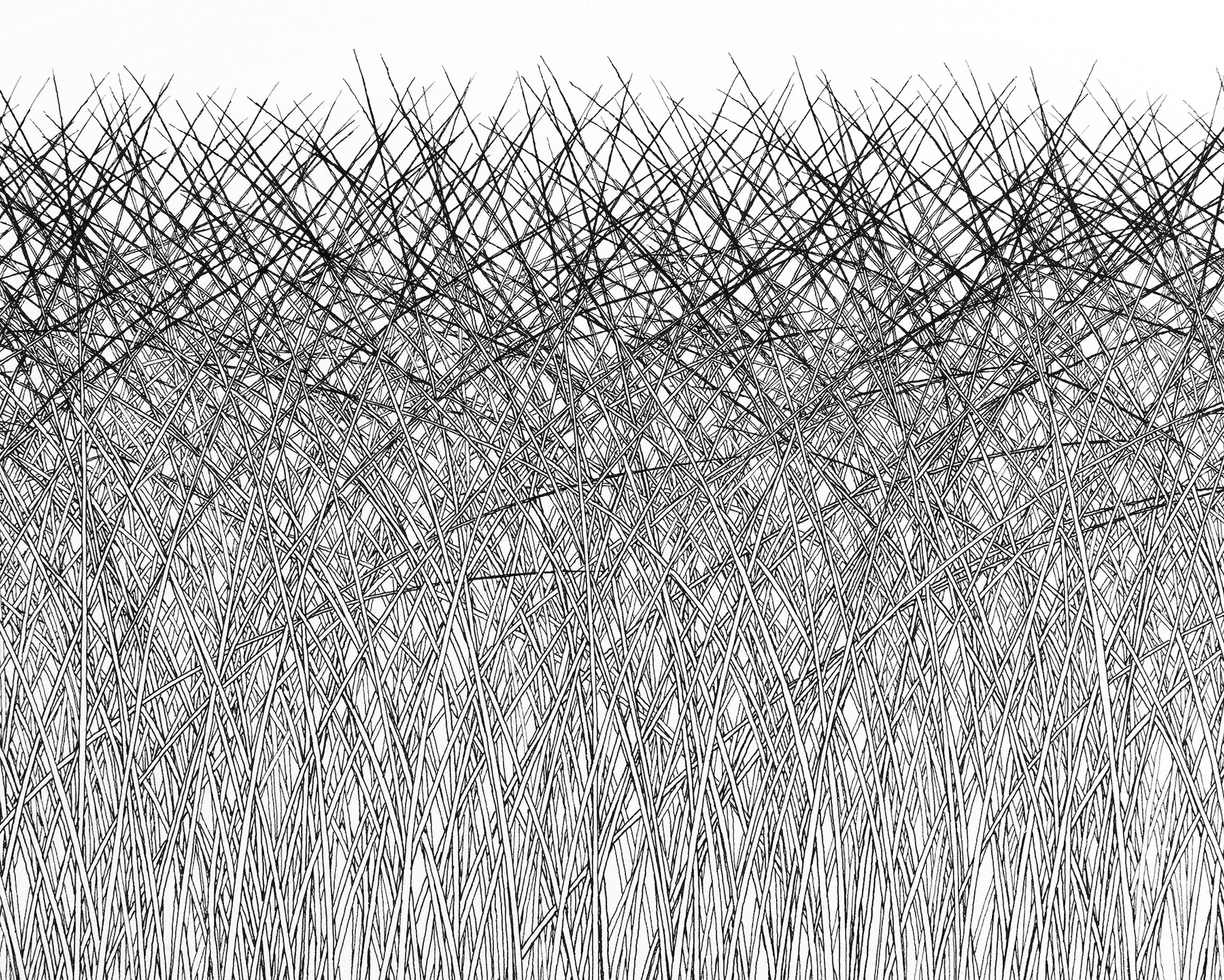 No noise, no wind, no air pollution. Stillness and perfect harmony, pure, unspoilt, permanent. So, are these blades of grass a few inches tall or monstrous 400 feet plants? The delicacy of the tops of these grasses, tipping over from the effects of gravity was an important part of controlling the line of the pen, one slip would ruin the harmony. Other subtleties include some blades tucked in behind some and in front of others. The ones most bent over never make it to the highest point and give depth to the top half of the picture.