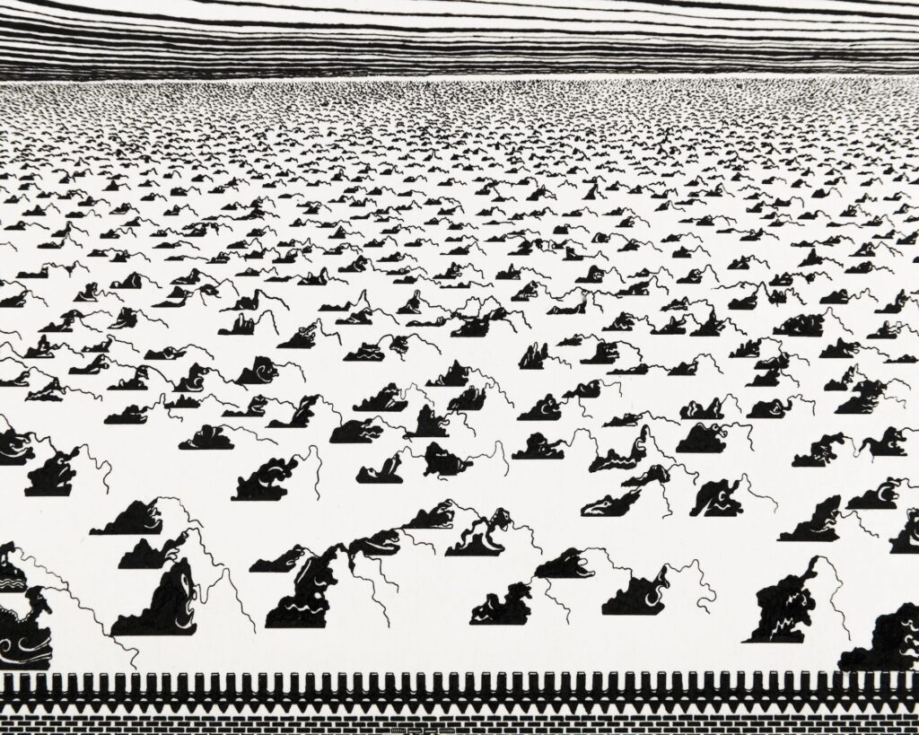 After visiting an outdoor pool at Whitley bay, walking at night, the pool had been drained with only a few inches depth of water left. Rocks had been placed in the pool to kick-start a little wildlife reserve. The night was extremely clear and still, with no traffic or any other noise to break this fragile glass atmosphere, enough for me to fill my mind with the idea of creating faces in the rocks. The moon cast a strong shadow on one side of the different shaped rocks, giving me the idea of producing magical faces, all pointing in a pre determined direction. The wall surround captures these ‘beings’, safeguarding the spectator from their intent. The re-occuring limitless distance is necessary to give the observer the real space one needs from time to time, keeping the detail of the faces in the rocks further away as much as I could. The semicircular shapes in the sky add to the magnitude of the space involved. They were drawn freehand without much thought about what the shape would be towards the centre of these semi-circles, forcing myself into a situation of the inner rings ‘edges’ not being the same consistency in shape as the outer rings.
