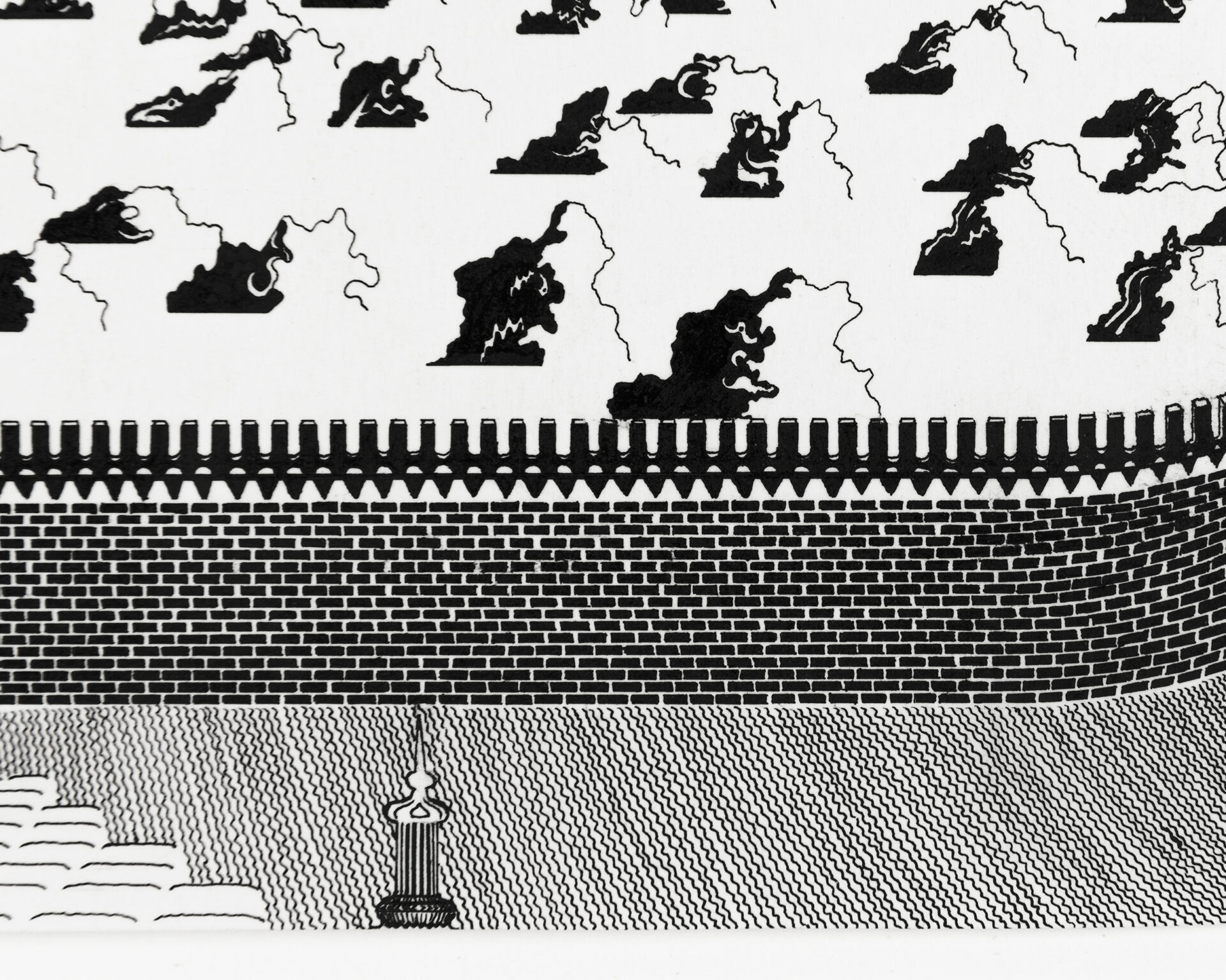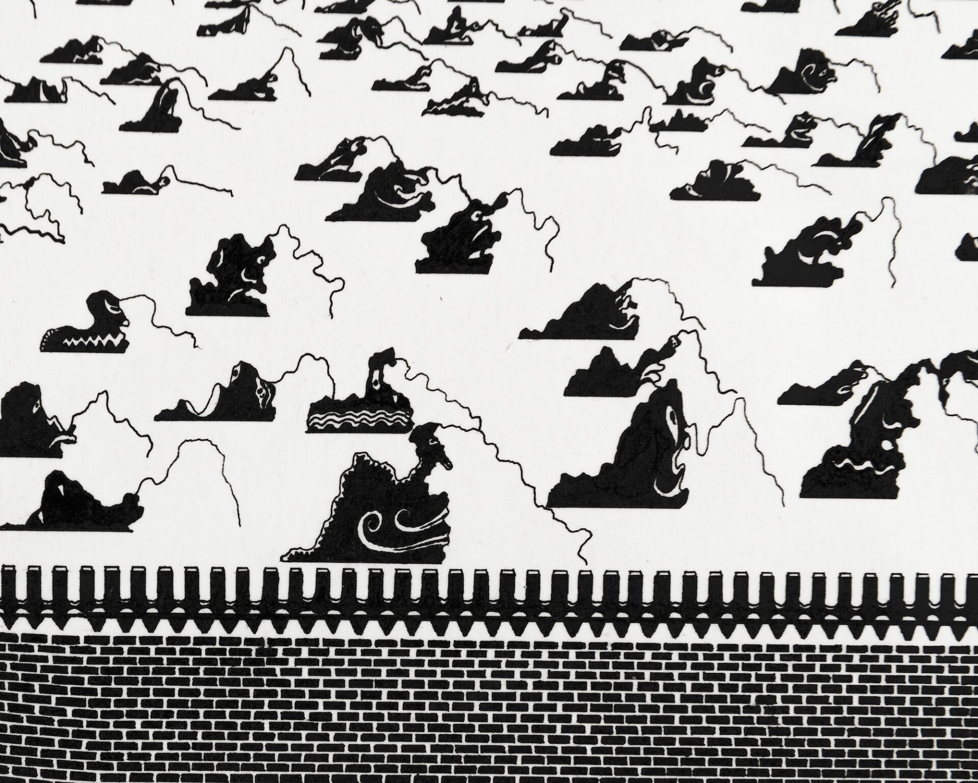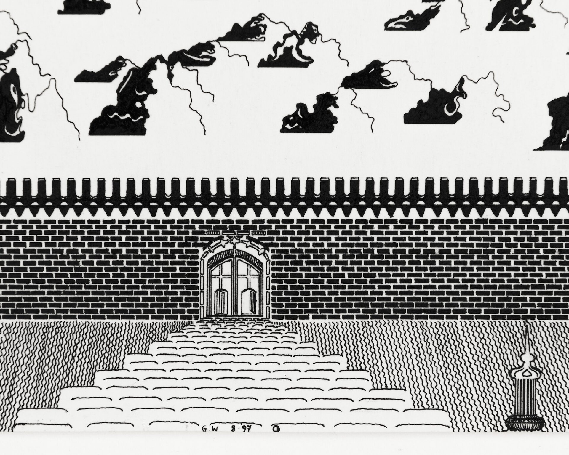 After visiting an outdoor pool at Whitley bay, walking at night, the pool had been drained with only a few inches depth of water left. Rocks had been placed in the pool to kick-start a little wildlife reserve. The night was extremely clear and still, with no traffic or any other noise to break this fragile glass atmosphere, enough for me to fill my mind with the idea of creating faces in the rocks. The moon cast a strong shadow on one side of the different shaped rocks, giving me the idea of producing magical faces, all pointing in a pre determined direction. The wall surround captures these ‘beings’, safeguarding the spectator from their intent. The re-occuring limitless distance is necessary to give the observer the real space one needs from time to time, keeping the detail of the faces in the rocks further away as much as I could. The semicircular shapes in the sky add to the magnitude of the space involved. They were drawn freehand without much thought about what the shape would be towards the centre of these semi-circles, forcing myself into a situation of the inner rings ‘edges’ not being the same consistency in shape as the outer rings.