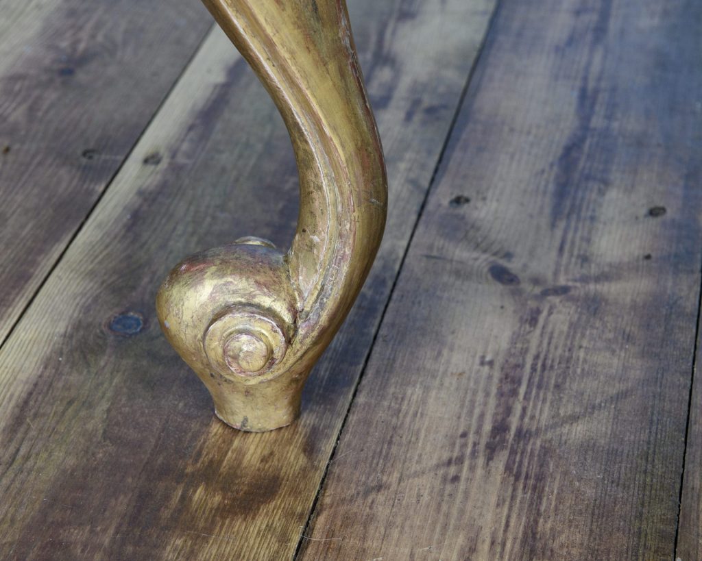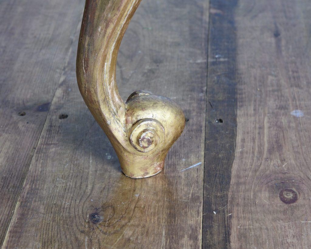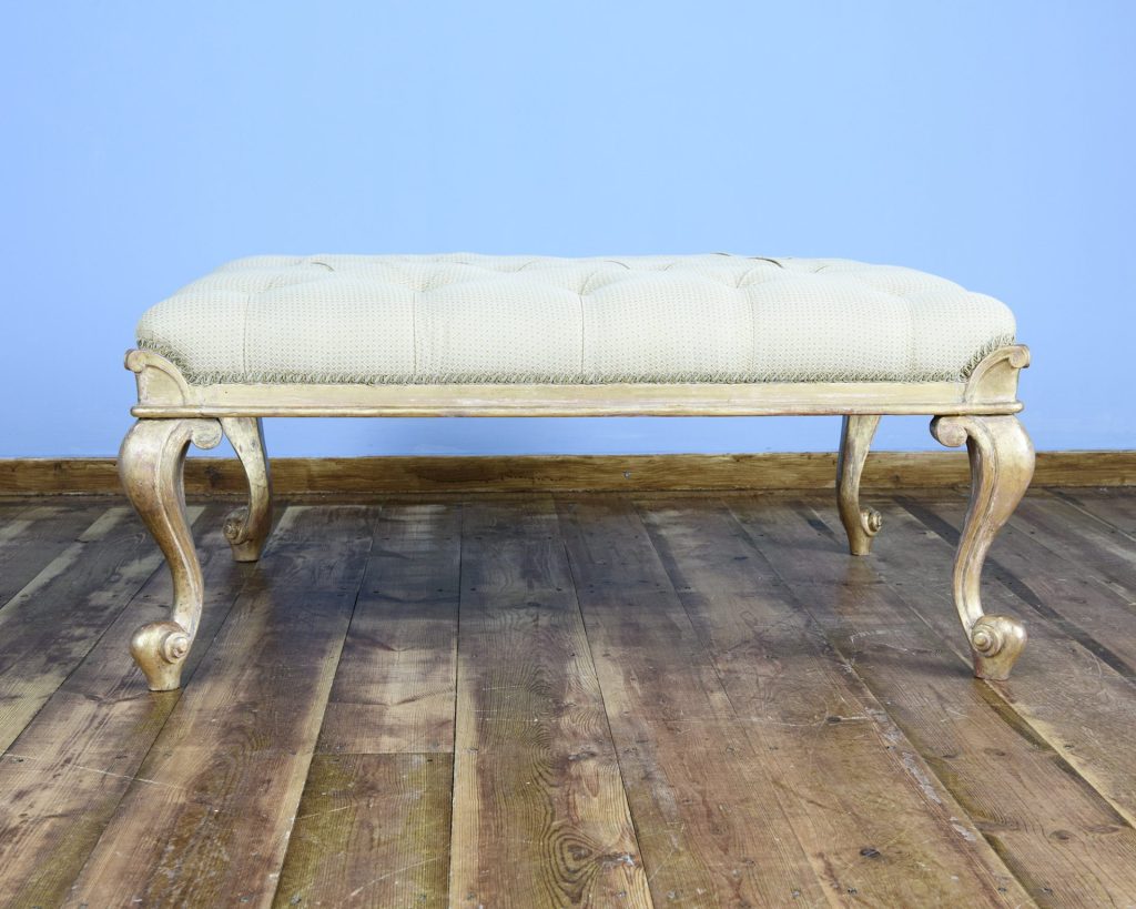 The 19th century stool is raised on solid carved giltwood cabriole legs with bold scrolled feet. The deep button upholstery is in excellent order.